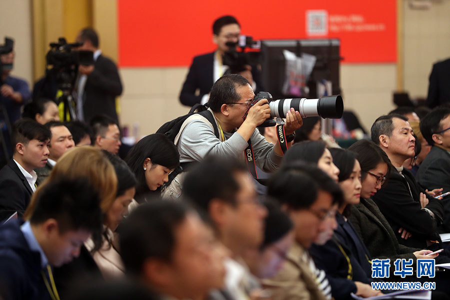 10月21日,十九大新聞中心舉辦記者招待會,邀請中共中央統戰部常務副部長張裔炯、副部長冉萬祥,中共中央對外聯絡部副部長郭業洲介紹黨的統一戰線工作和黨的對外交往情況,并回答記者提問。圖為現場記者。新華網 郝廣鵬攝