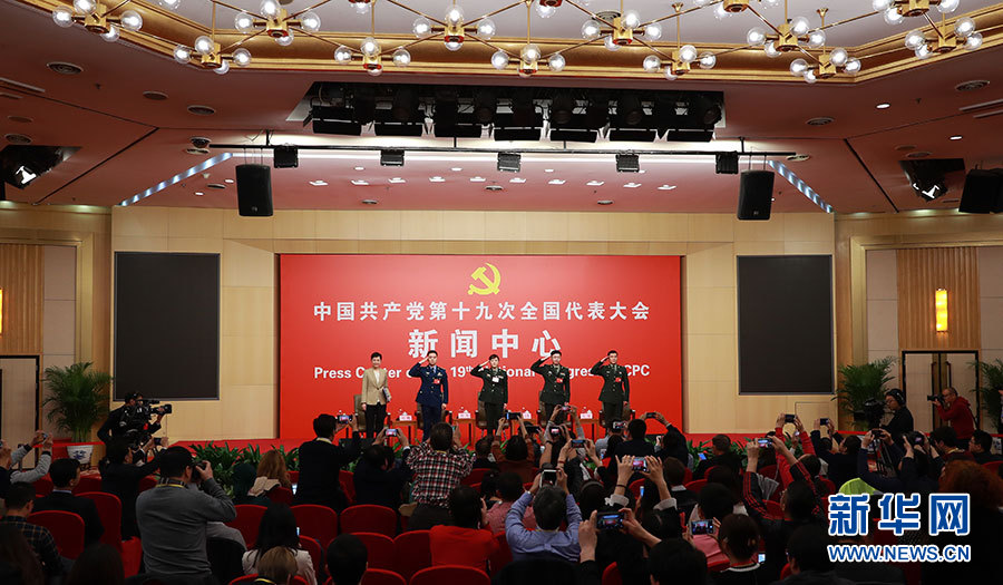 10月22日,十九大新聞中心在梅地亞中心二層新聞發布廳舉辦集體采訪活動,主題為“中國特色強軍之路邁出堅定步伐”。圖為集體采訪活動現場。新華網 郝廣鵬攝