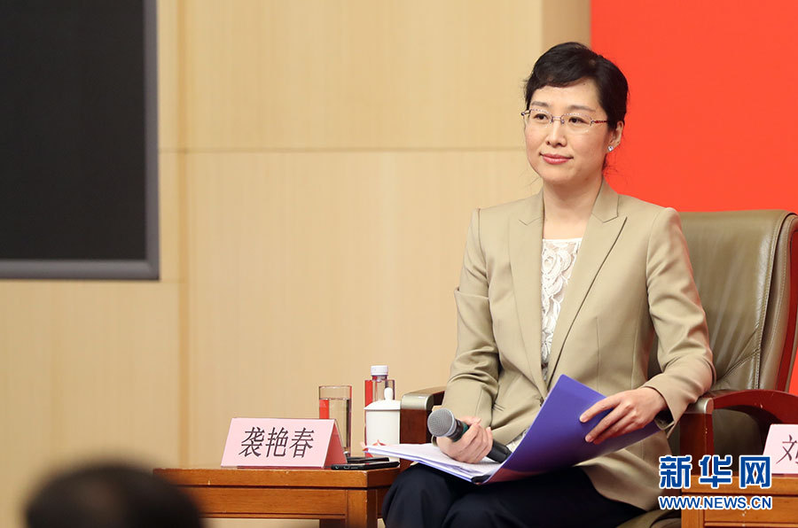 10月22日,十九大新聞中心在梅地亞中心二層新聞發布廳舉辦集體采訪活動,主題為“中國特色強軍之路邁出堅定步伐”。圖為主持人襲艷春。新華網 郝廣鵬攝
