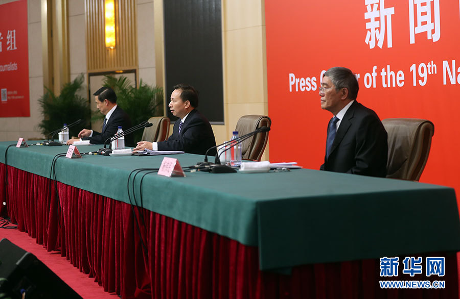 10月23日,十九大新聞中心舉辦記者招待會,邀請中央財經領導小組辦公室副主任楊偉民,環境保護部黨組書記、部長李干杰介紹踐行綠色發展理念,建設美麗中國有關情況,并回答記者提問。圖為記者招待會現場。新華網 郝廣鵬攝