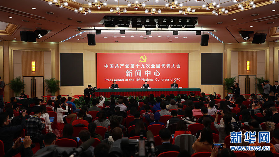 10月23日,十九大新聞中心舉辦記者招待會,邀請中央財(cái)經(jīng)領(lǐng)導(dǎo)小組辦公室副主任楊偉民,環(huán)境保護(hù)部黨組書記、部長李干杰介紹踐行綠色發(fā)展理念,建設(shè)美麗中國有關(guān)情況,并回答記者提問。圖為記者招待會現(xiàn)場。新華網(wǎng) 郝廣鵬攝