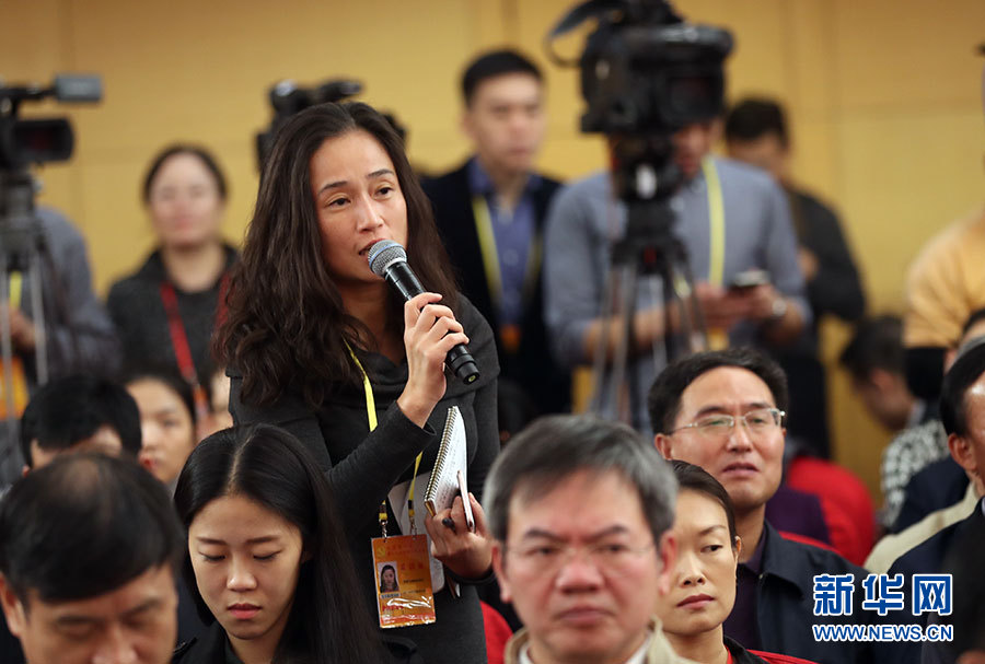 10月23日,十九大新聞中心舉辦記者招待會,邀請中央財經領導小組辦公室副主任楊偉民,環境保護部黨組書記、部長李干杰介紹踐行綠色發展理念,建設美麗中國有關情況,并回答記者提問。圖為華爾街日報記者提問。新華網 郝廣鵬攝