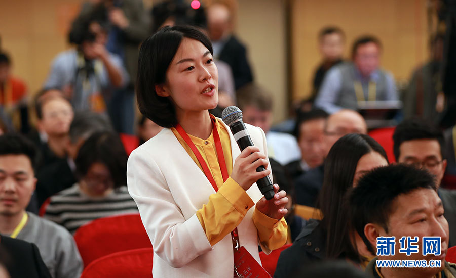 10月23日,十九大新聞中心舉辦記者招待會,邀請中央財經領導小組辦公室副主任楊偉民,環境保護部黨組書記、部長李干杰介紹踐行綠色發展理念,建設美麗中國有關情況,并回答記者提問。圖為中新社記者提問。新華網 郝廣鵬攝