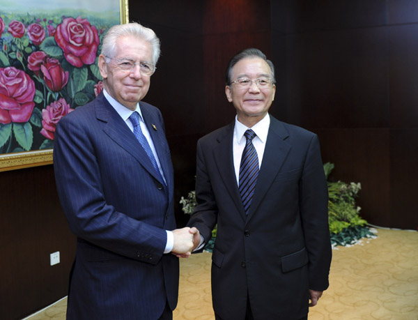 ??? 11月5日,國務院總理溫家寶在老撾首都萬象會見出席第九屆亞歐首腦會議的意大利總理蒙蒂。 新華社記者張鐸攝