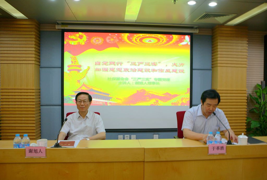 5月25日下午,全國社會保障基金理事會謝旭人理事長為全體干部職工講授了題為“自覺踐行三嚴三實,大力加強思想政治建設和作風建設”的專題黨課,同時對開展“三嚴三實”專題教育進行了動員。于革勝副理事長主持會議,中央組織部干部四局張晨光同志應邀參加。