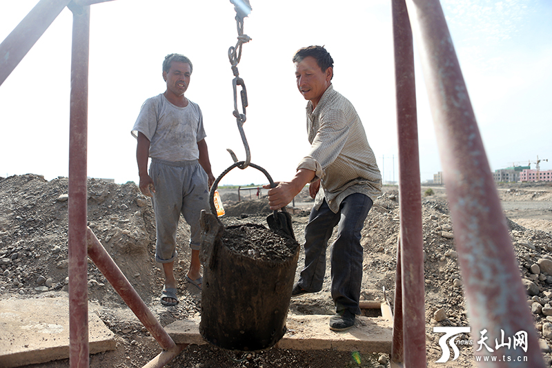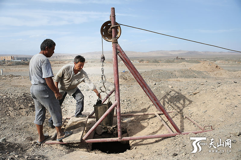 一根繩、一個桶、一輛拖拉機頭,就是庫爾班·司馬義所有的作業(yè)工具。下井時,人坐在一個T形的鐵管上,用繩索固定好,一頭連著的拖拉機緩緩開動,將繩索這頭的人吊入豎井中。大約七八分鐘后,拖拉機后退,一小桶泥沙從井里升上來,庫爾班和伙計們小心地站在井口,伸手取下桶來,將泥沙倒掉又掛在繩索上,如此重復(fù)。