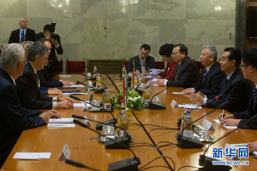??? 9月11日,中共中央書記處書記、中央紀委副書記趙洪祝(右二)在匈牙利首都布達佩斯會見匈牙利國會主席克韋爾(左二)。應匈牙利執政黨青民盟邀請,中共中央書記處書記、中央紀委副書記趙洪祝率中共代表團于9月10日至11日訪問匈牙利。新華社發(弗爾季·奧蒂洛攝)