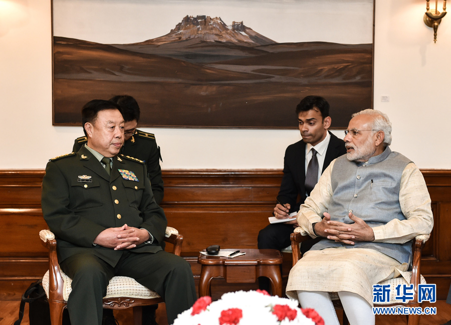 ??? 11月17日,正在印度訪問的中央軍委副主席范長龍(前左)在新德里會見印度總理莫迪(前右)。 新華社發