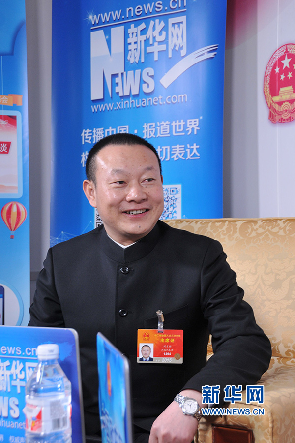 ??? 2015年3月12日,全國人大代表劉文新在人民大會(huì)堂新華網(wǎng)/中國政府網(wǎng)兩會(huì)訪談間接受記者專訪。新華網(wǎng)/中國政府網(wǎng)?李非 攝