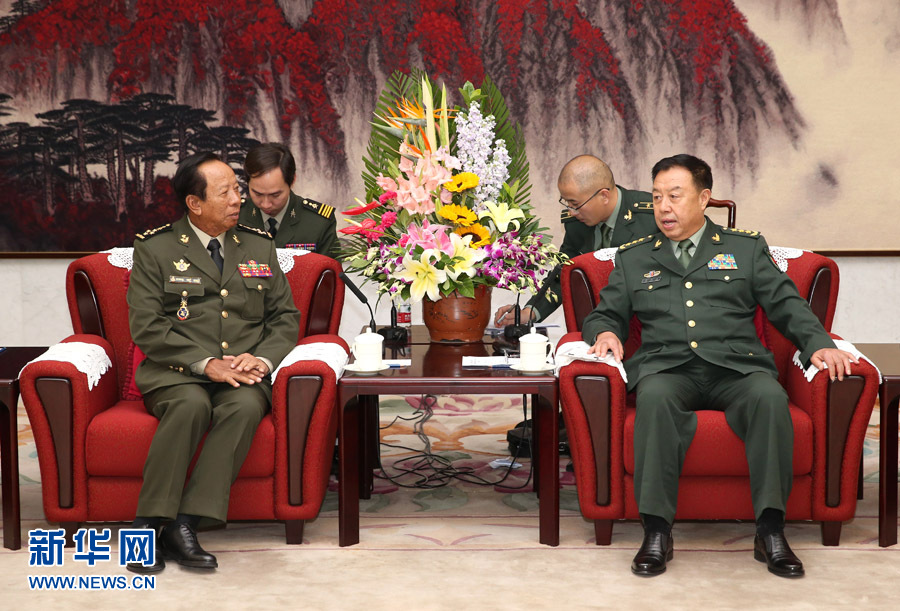 ??? 10月13日,中央軍委副主席范長(zhǎng)龍?jiān)诒本?huì)見柬埔寨王國(guó)副首相兼國(guó)防大臣迪班。 新華社記者 馬占成 攝