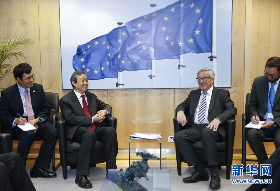 10月18日,在比利時首都布魯塞爾歐盟委員會總部,出席第六次中歐經(jīng)貿高層對話的國務院副總理馬凱(左二)會見歐盟委員會主席容克(右二)。新華社記者葉平凡攝