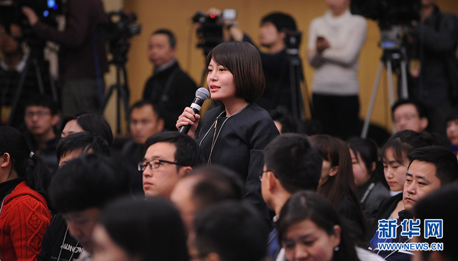 ?????十二屆全國人大四次會議新聞中心于3月12日(星期六)14時30分在梅地亞中心多功能廳舉行記者會,邀請國務院國有資產監督管理委員會主任肖亞慶、副主任張喜武、副主任黃丹華和副秘書長、新聞發言人彭華崗就“國企改革”的相關問題回答中外記者的提問。圖為經濟參考報記者提問。新華網/中國政府網 陳杰 攝