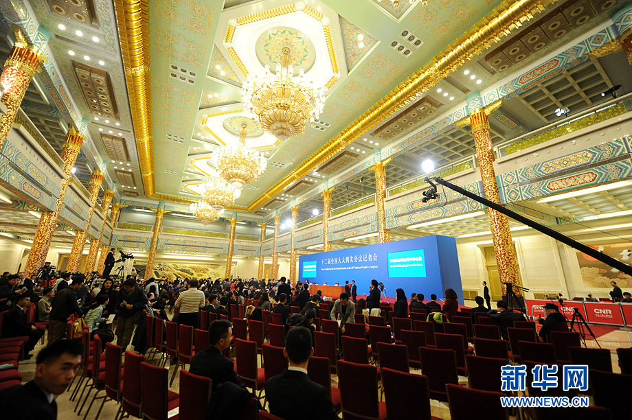 3月16日上午,國務院總理李克強在人民大會堂三樓金色大廳會見采訪十二屆全國人大四次會議的中外記者并回答記者提出的問題。圖為記者會現場。距記者會開始還有一段時間,現場已經人頭攢動。新華網/中國政府網 陳競超 攝