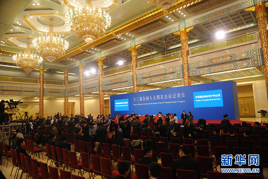 3月16日上午,國務院總理李克強在人民大會堂三樓金色大廳會見采訪十二屆全國人大四次會議的中外記者并回答記者提出的問題。圖為記者在準備工作。新華網/中國政府網 陳杰攝
