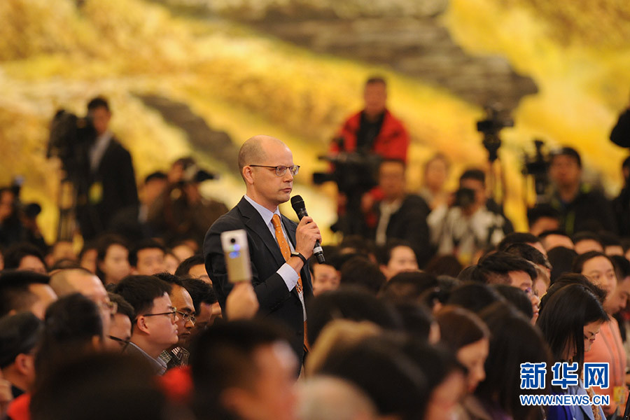 3月16日上午,國務院總理李克強在人民大會堂三樓金色大廳會見采訪十二屆全國人大四次會議的中外記者并回答記者提出的問題。圖為彭博新聞社記者提問。新華網(wǎng)/中國政府網(wǎng) 陳杰攝