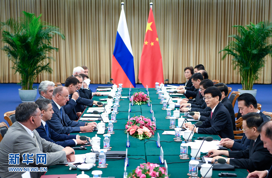 7月27日,中共中央政治局委員、中央政法委書記孟建柱在北京同俄羅斯聯邦安全會議秘書帕特魯舍夫共同主持召開中俄執法安全合作機制第四次會議。新華社記者 張領 攝