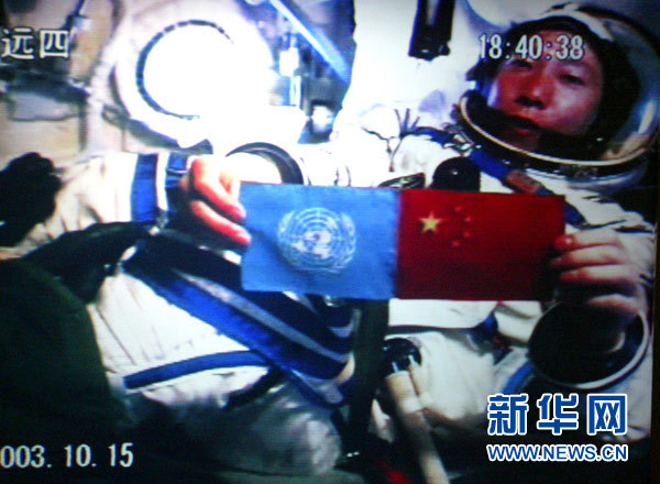 北京時間2003年10月15日18時40分,中國培養的第一位航天員楊利偉從太空向世界各國人民問好,并在艙內并列展示了五星紅旗和聯合國旗(資料照片,攝于北京航天指揮控制中心大屏幕)。新華社發