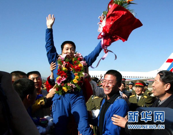 航天英雄楊利偉返回北京后被高高舉起(資料照片)。新華社發