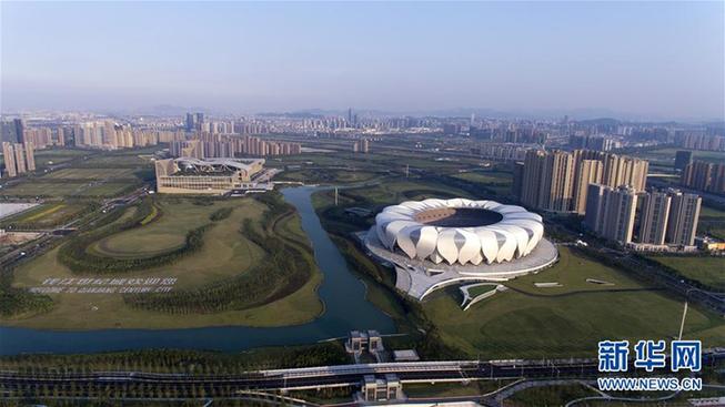 俯瞰浙江杭州奧體中心主體育場和杭州國際博覽中心(2016年8月25日攝)。新華社記者 鞠煥宗 攝
