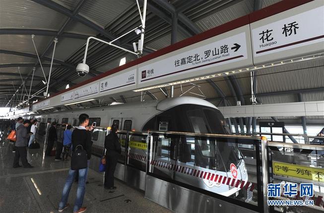 2013年10月16日,上海地鐵11號(hào)線北段延伸工程花橋段(上海安亭站至江蘇昆山花橋站)開通試運(yùn)營。這是乘客在江蘇昆山花橋站站臺(tái)候車。新華社記者 劉巍巍 攝
