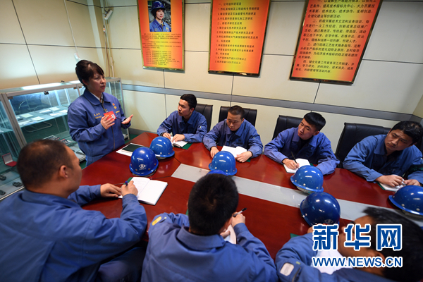 在甘肅酒鋼集團宏興鋼鐵股份有限公司碳鋼薄板廠內的王云平勞模創新工作室,王云平(左二)宣講黨的十九大精神(11月1日攝)。 新華社記者 范培珅 攝