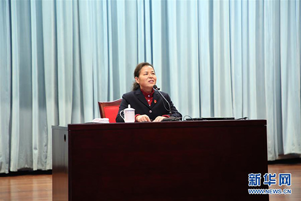 孫金娣組織“貫徹十九大,聽總書記話,永遠跟黨走”黨員群眾大會,并進行宣講(11月10日攝)?!⌒氯A社記者楊紹功攝