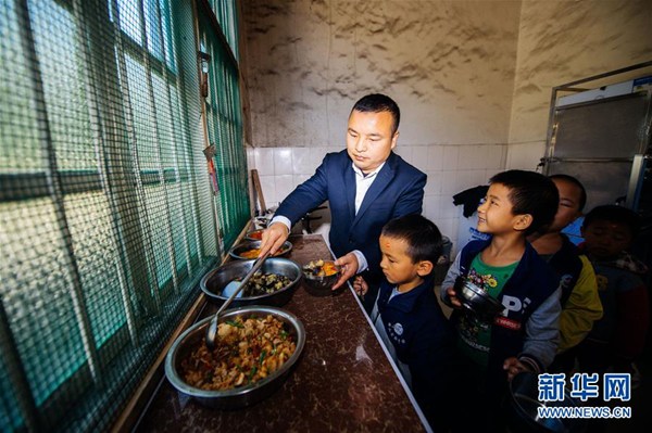 11月8日,湖南省花垣縣十八洞小學教師吳忠碧為學生打午餐。新華社記者 劉金海 攝