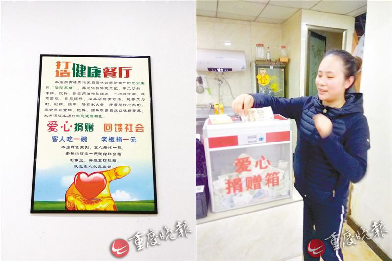 抄手店的店規(左)。老板張德蓉當面存入捐款箱,有些顧客會額外多捐(右)。