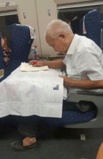 6月12日,在回北京的高鐵二等座上,為了做好一場報告,78歲高齡的中國工程院院士劉先林仍然筆耕不輟。照片在微博發布后,迅速引發網友的點贊和致敬。眼尖的網友發現劉先林院士穿的舊皮鞋十分樸素,不禁感慨:“這又是一個掃地僧式的世外高人。”