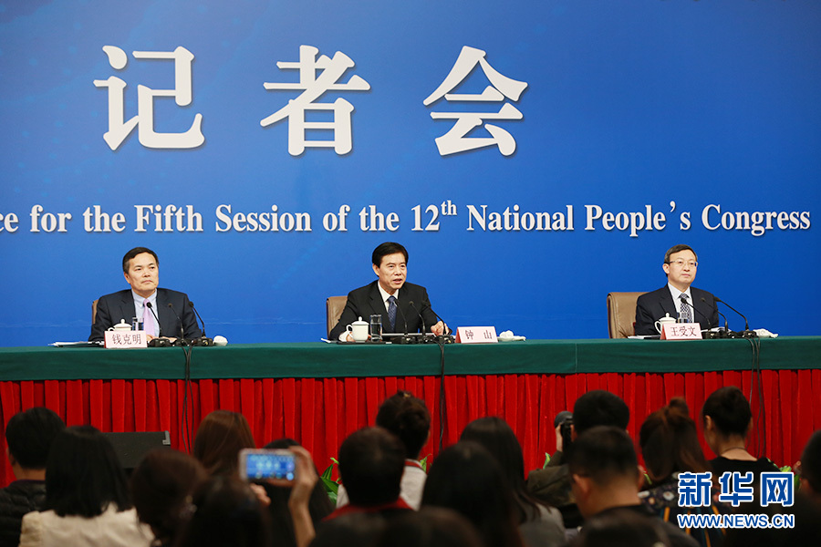 3月11日,十二屆全國人大五次會議新聞中心舉行記者會,主題是“改革開放調結構 創新驅動促發展”,商務部部長鐘山、副部長王受文、副部長錢克明出席并回答中外記者的提問。圖為記者會現場。 新華網/中國政府網 傅義洲 攝
