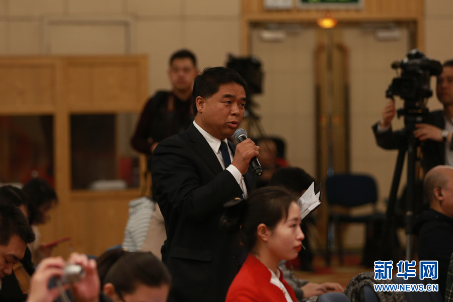 3月14日,十二屆全國人大五次會議新聞中心舉行記者會,邀請國家質檢總局局長支樹平、副局長兼國家認證認可監(jiān)督管理委員會主任孫大偉、國家標準化管理委員會主任田世宏就“質量提升”的相關問題回答中外記者的提問。圖為消費日報記者提問。新華網(wǎng)/中國政府網(wǎng) 傅義洲 攝