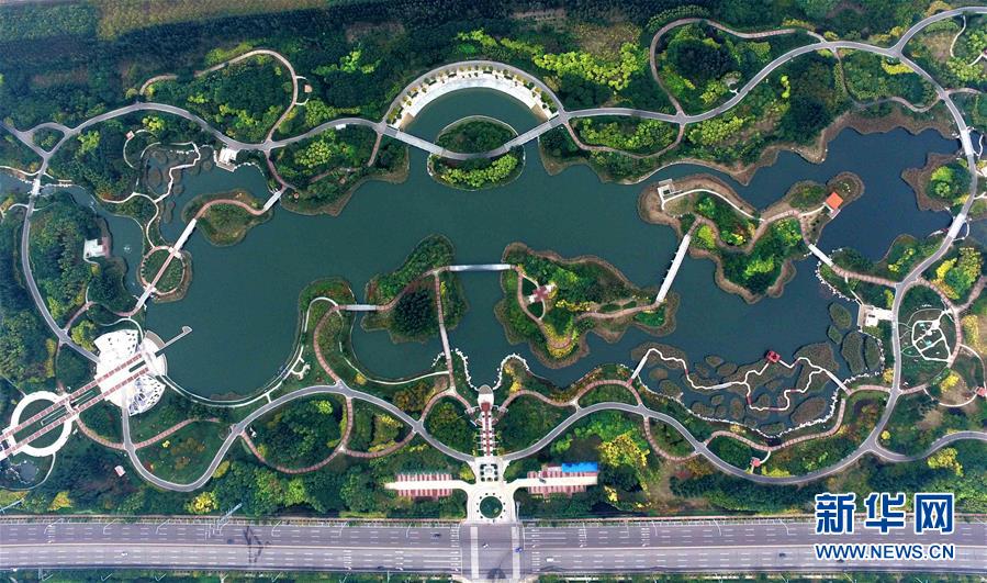 俯瞰天津濱海新區臨港經濟區的臨港生態濕地公園(2016年10月21日攝)。臨港生態濕地公園多年來對工業區內的污水和雨水進行凈化處理和循環利用,污水經二次處理達到1級A標準,用于綠植灌溉等市政用水,減少污染物入海。新華社記者 岳月偉 攝