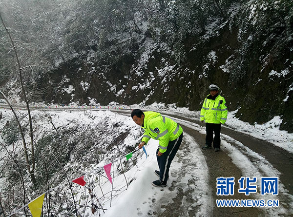 因道路坡陡,路面結冰,湖北五峰土家族自治縣“路長”朱漢軍(左)和袁樂軍(右)在劉家坳路段拉起簡易警戒線(1月5日攝)。新華社記者 王自宸 攝