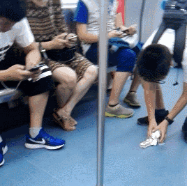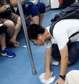 江蘇無錫地鐵1號線上,一個小男孩在用紙巾擦拭地面上的臟物,持續了十分鐘,直到擦干凈。?