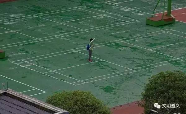 遵義市一名小學生因為遲到,冒雨奔向教室。