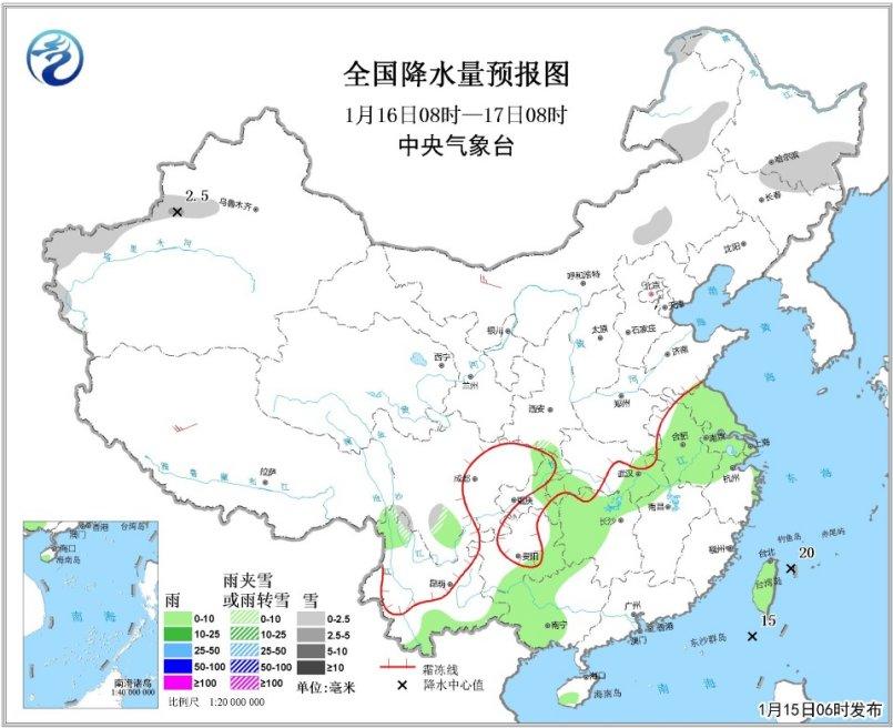 全國降水量預報圖(1月15日08時-16日08時)