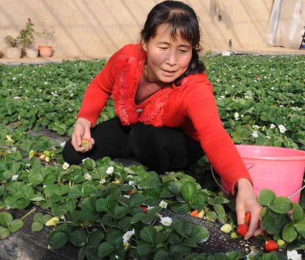 1月19日,甘肅省永靖縣三塬鎮下塬村村民采摘成熟的草莓。新華社發(王銘禹 攝)