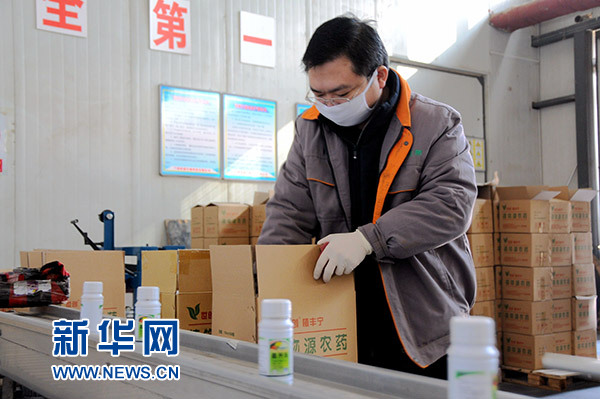1月19日,在甘肅省植物源生物農藥工程技術研究中心生產車間,工人在包裝生物農藥。新華社發(王銘禹 攝)