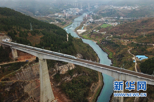 1月25日,渝貴鐵路從貴陽北到重慶西的D8592次首發動車經過遵義市境內的烏江大橋。 當日,設計時速200公里的渝貴鐵路全線開通運營。新華社記者 劉續攝