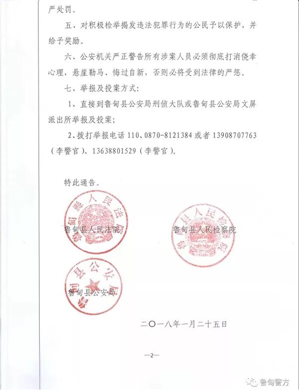 與此同時,魯甸縣公安局、法院、檢察院聯合發出通告稱,部分不法人員在魯甸縣文屏鎮崇文社區圍攻、毆打處警公安干警并砸毀警車,其行為已觸犯《中華人民共和國刑法》、《中華人民共和國治安管理處罰法》,構成違法犯罪,公安機關已經掌握違法犯罪嫌疑人的違法犯罪事實,限期在2月3日凌晨0點前主動到公安機關投案自首、交代違法犯罪事實,可依法從輕、減輕或免除處罰,逾期拒不投案自首的,將依法嚴懲。