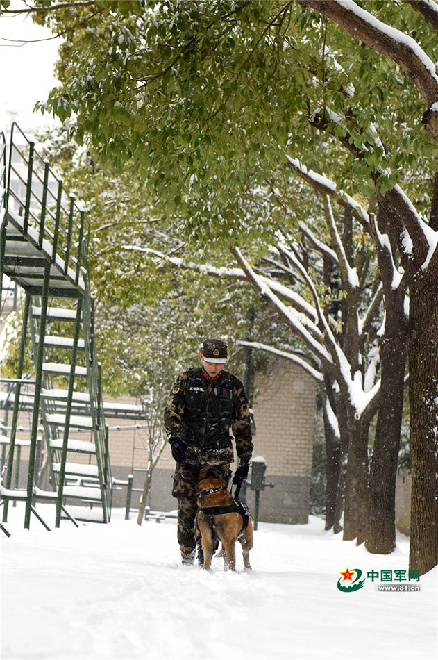 1月27日,武警安徽總隊(duì)機(jī)動支隊(duì)警犬班班長王營廣與警犬“魯克”互動交流,增進(jìn)情感。