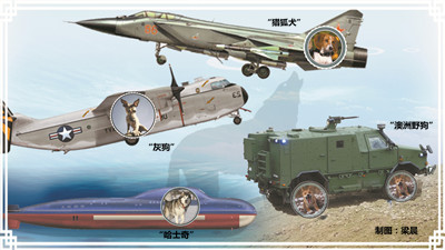 現代戰爭中,偵察通信、巡邏警衛、搜救排爆等軍犬的傳統優勢領域漸漸被高科技的信息化裝備所替代。不過,為了表達人類對狗的喜愛和依賴,很多武器裝備仍用“狗”或“犬”等字眼來命名。它們上天入地下海,各顯神通,爭雄斗勝,身懷絕技,發展出兵器家族中的一股“生猛”力量。