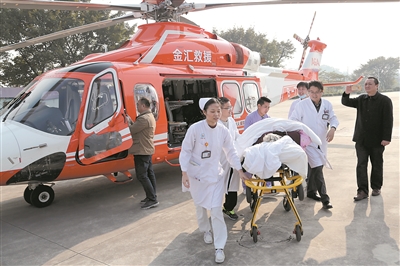 直升機(jī)一降落,早早候著的救護(hù)車就把患者送到醫(yī)院。