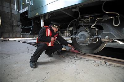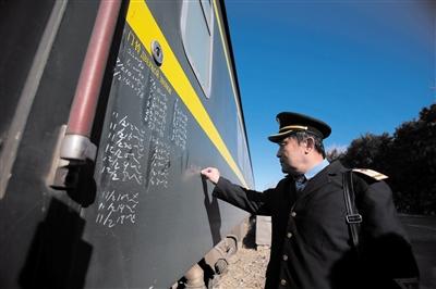 昨日,北京西車務(wù)段101站,57歲的值班員趙志剛在臨客車廂上做巡視記錄。記者 朱駿 攝
