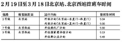 2號(hào)線、7號(hào)線、9號(hào)線2月19日至3月18日首班車時(shí)段加開;緩解北京站、北京西站返程客流壓力