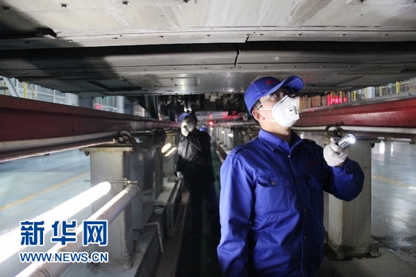 一同下到檢修道的楊碩提醒記者,在車底檢修的兩名小伙兒使用的手電筒可“大有玄機(jī)”。它在照明的同時(shí)還一直在錄像,相關(guān)資料會(huì)上傳到系統(tǒng)里,由電腦再次進(jìn)行智能檢測(cè)。
