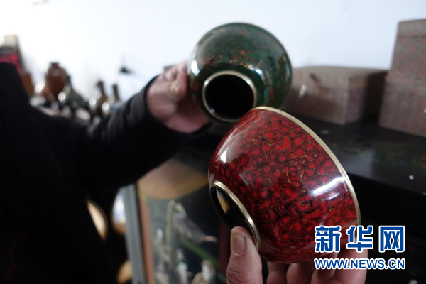 “流淌漆”技藝制作的花瓶。“流淌漆”即通過變換液態漆的濕度及流下的角度,使之形成自然的漆面花紋。新華網 卓越 攝