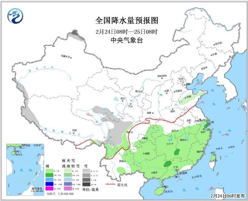 24日08時至25日08時,新疆北部、西藏西部、川西高原、青海東南部、山東北部等地有小到中雪或雨夾雪,局地大雪;云南東部、江漢南部、江南大部、華南大部等地有小雨,局地中雨。華北南部、黃淮、江漢東部、江淮北部等地及環渤海地區有4~6級風。黃海中部、東海北部等海域將有5~7級、陣風8級的東北風。