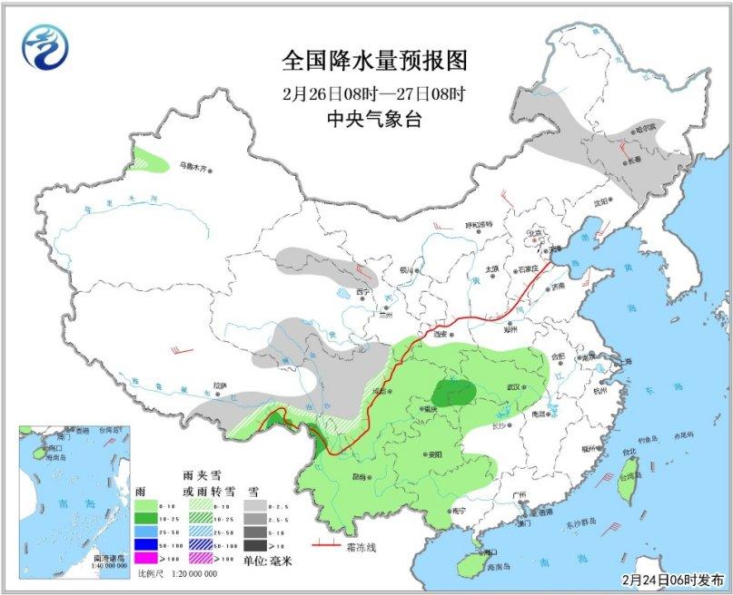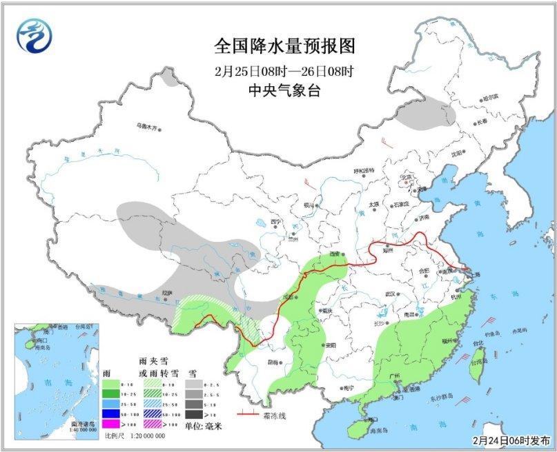 25日08時至26日08時,青藏高原中部和南部等地有小雪或雨夾雪;西北地區東南部、四川盆地、江南南部、華南中東部、云南西北部和東部、海南島、臺灣等地有小雨或陣雨。內蒙古中西部等地有4~5級風。東海大部、臺灣海峽等海域有6~7級、陣風8級的東北風。