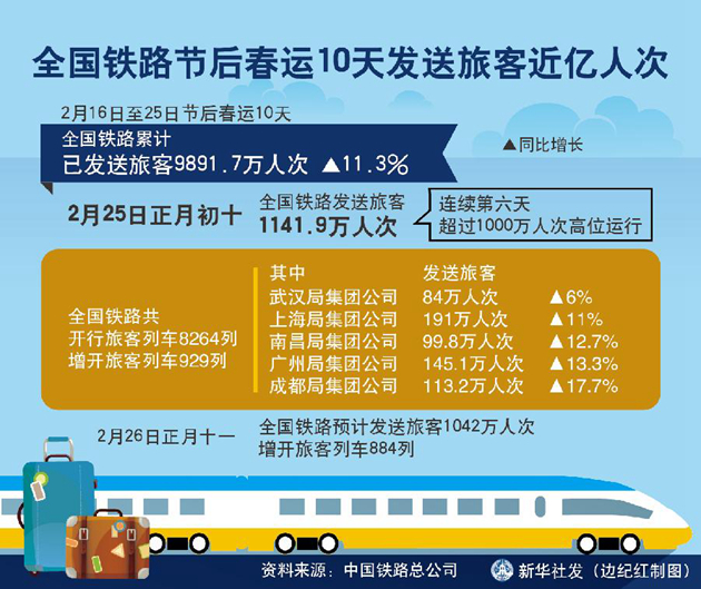 2月26日,全國(guó)鐵路發(fā)送旅客1084萬(wàn)人次,客流略有回落但仍保持高位運(yùn)行,已連續(xù)七天超過(guò)1000萬(wàn)人次;春運(yùn)同比增加145.5萬(wàn)人次,增長(zhǎng)15.5%,為今年春運(yùn)以來(lái)同比增幅最大的一天。全國(guó)鐵路共開(kāi)行旅客列車8155列,增開(kāi)旅客列車884列。武漢局集團(tuán)公司當(dāng)日發(fā)送旅客78.3萬(wàn)人次,同比增長(zhǎng)8.5%;上海局集團(tuán)公司發(fā)送旅客185.6萬(wàn)人次,同比增長(zhǎng)15.2%;南昌局集團(tuán)公司發(fā)送旅客92.5萬(wàn)人次,同比增長(zhǎng)12.7%;廣州局集團(tuán)公司發(fā)送旅客137.5萬(wàn)人次,同比增長(zhǎng)16.8%;成都局集團(tuán)公司發(fā)送旅客108.6萬(wàn)人次,同比增長(zhǎng)18.8%。